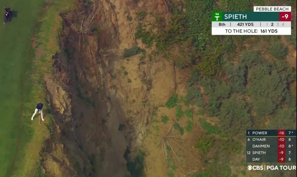 A relatively short tee shot by any standards, let alone the Tour, sees players hit to the top of the hill, where one can go no further. A yawing chasm exists at the end of this stretch of fairway. Simply, there is no bombing this as far as possible. A steep, terrifying cliff gives way to the azure of the Pacific, and doesn’t reform into terra firma until extremely close to the green. Just ask Jordan Spieth, who Players usually have a 170 yard distance from a very elevated vantage point and like Ballybunion, are left at the mercy of the coastal winds as to how and what to play. The skillset is tested by having to hit shots that ride or fly under the wind, and stop on a small green (recently extended but still small by most standards).